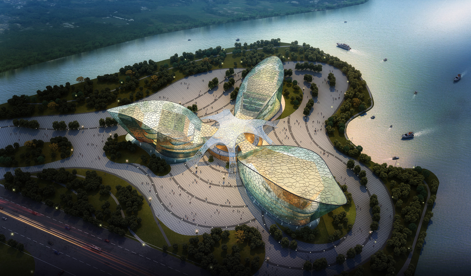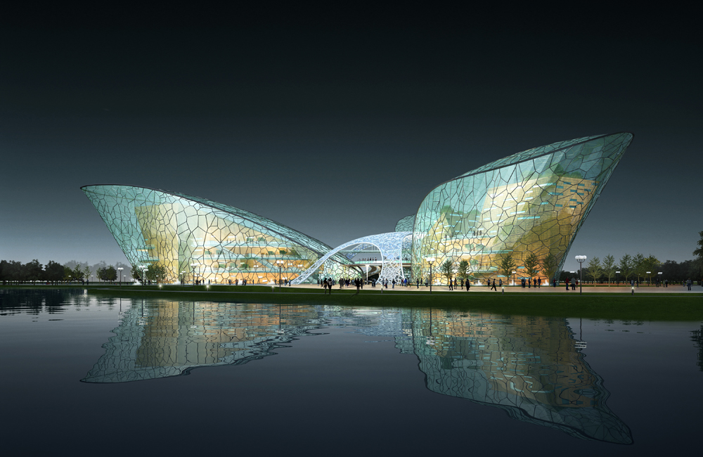2012年,筑冶与同济科技园区同样从事景观设计的企业----上海禾木城市规划设计有限公司携手合作了山东某文化艺术中心投标项目,设计方案将“瓣”“桥”“苑”三大理念融于文化建筑设计,整个建筑群如盛开的花瓣,“花瓣”状的建筑体块之间的中央广场由一块形似“花蕊”的屋顶覆盖,如“桥”一般将各个功能块紧密联系。整个建筑群以“花瓣”之形态为灵感,向外伸展,代表着开放包容的姿态;以“桥”之形态象征纽带、交流以及人们心灵和思想相互沟通;以“苑”象征生态文化与传统文化的结合,倡导文化可持续发展。