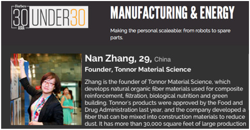 近日,我园区大学生创业企业家张楠又获殊荣,美国知名财经媒体福布斯发布了亚洲地区30位30岁以下商业领袖“Forbes 30 Under 30 Asia”榜单,上海同化新材料科技有限公司董事长张楠入选(张楠曾在2014年荣获福布斯中国30位30岁以下创业者)。这是福布斯首份以亚洲作为评选范围的榜单,涉及十个领域的30岁以下的亚洲领军人物。 其中同化新材料创始人、董事长张楠入选了制造和能源榜单。