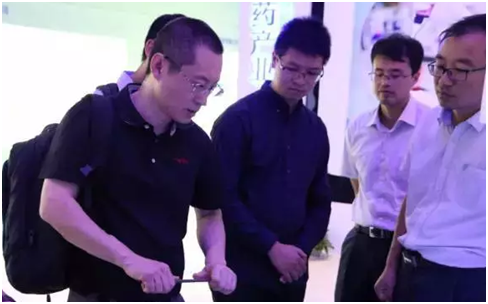 (图为威海市蓝色经济研究院海洋生物工程研究所相关领导参观“净梧”展台)