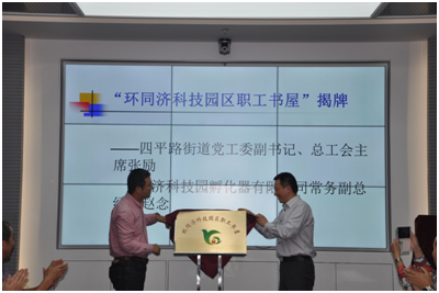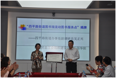 活动上,四平路街道党工委副书记、总工会主席张励与同济科技园孵化器有限公司常务副总经理赵念共同为环同济科技园区职工书屋揭牌,四平路街道办事处副调研员吴正兴与杨浦区图书馆馆长潘立敏共同为四平路街道图书馆流动图书服务点揭牌。