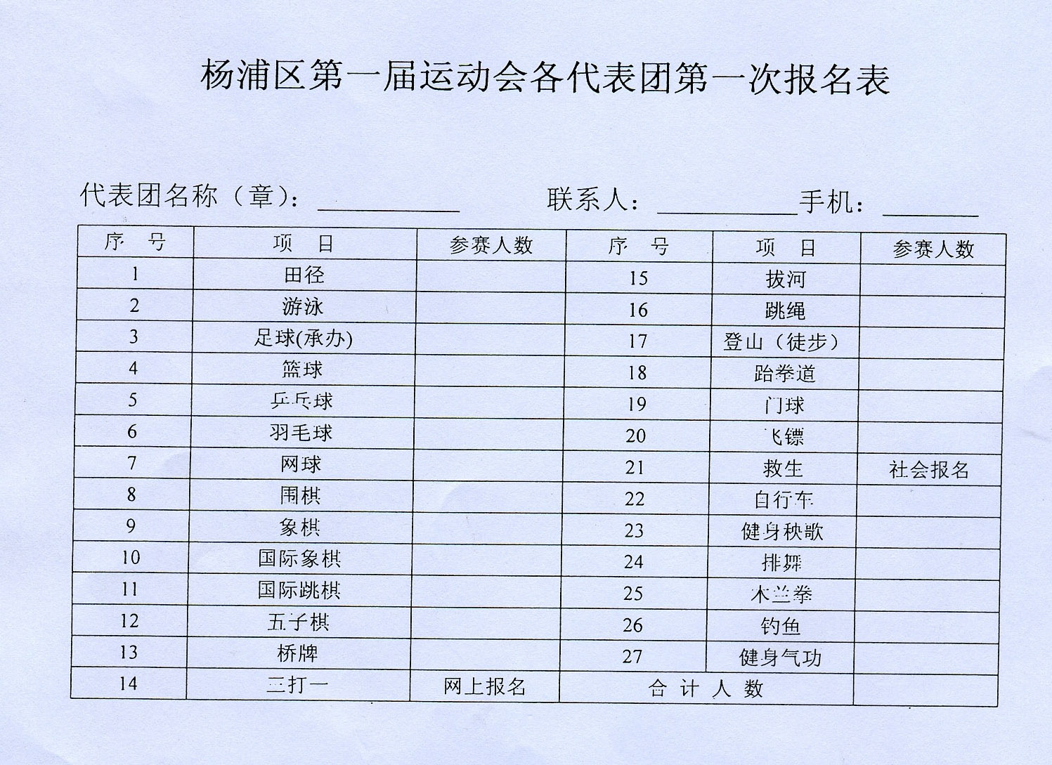 近日接到杨浦区科技园区管理办公室“关于组织园区企业参加杨浦区第一届运动会”的通知——本次运动会由杨浦区政府主办,区体育局、区总工会、区教育局、区文化局等单位承办,将于2012年6月—12月举办。杨浦区科技园区管理办公室将组织各科技园区及企业参加,参赛资格没有限制(凡在杨浦区工作、生活的市民均可报名参加),现在开展报名活动。