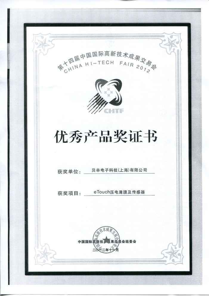 11月21日,在被誉为“中国科技第一展”--中国国际高新技术成果交易会(简称高交会)的闭幕式上,园区企业贝辛电子科技(上海)有限公司凭借eTouch压电薄膜传感器获得第十四届中国国际高新技术成果交易会优秀产品大奖。