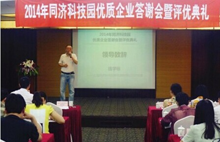 会议首先由上海同济科技园有限公司常务副总钱学标先生作开场致辞,钱总表示2013年园区不断加强创业苗圃—孵化器—加速器—产业集群四个阶段的全方位企业服务体系的建立和完善,为培育高层次创新创业人才和战略性新兴产业的源头企业提供了良好的建设发展环境。随后,园区对2013年度有杰出表现的企业进行了现场表彰授奖。获奖企业同臣环保、龙诚自动化、同豪土木、盈蓝环保等企业代表就园区扶持和企业发展历程等方面和与会企业进行了分享。